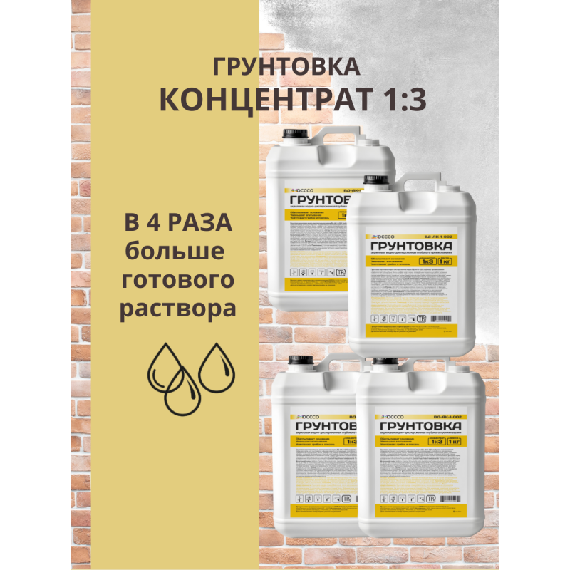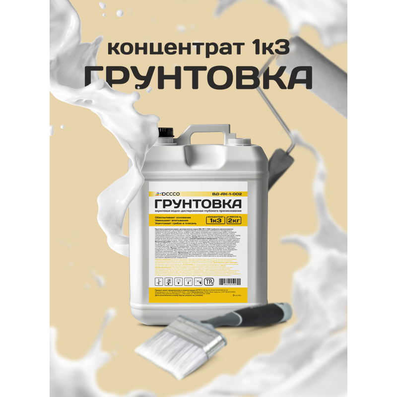 Грунтовка акриловая концентрированная, высокоадгезионная, влагостойкая. Предназначена для снижения впитывающей способности, увеличения адгезии и укрепления поверхности перед наклеиванием обоев, шпатлеванием и окрашиванием штукатурок, кирпича, гипсокартона, сухих шпатлевок, алебастровых и гипсовых поверхностей внутри и снаружи помещений. Влагостойкая, предупреждает разрушение стен, препятствует образованию сырости на поверхности. Высокоадзезионная грунтовка крепко сцепляет основу и финишное покрытие, уменьшает расход декоративных материалов. Грунтовка глубоко пропитывает верхний слой поверхности, выравнивает ее впитывающую способность, что облегчает нанесение шпатлевки и краски, снижает расход и значительно увеличивает долговечность покрытия. Содержит антисептик. Концентрированная грунтовка имеет экономичный расход. Полное высыхание - от 1 часа. Расход 220-270 г/м2.