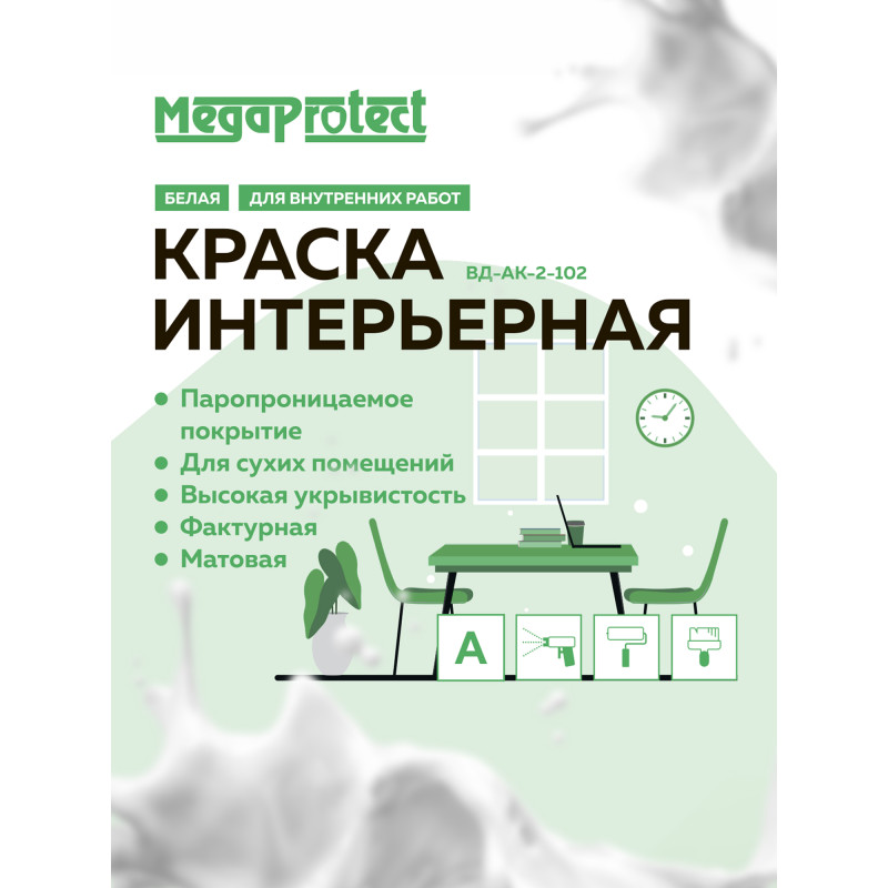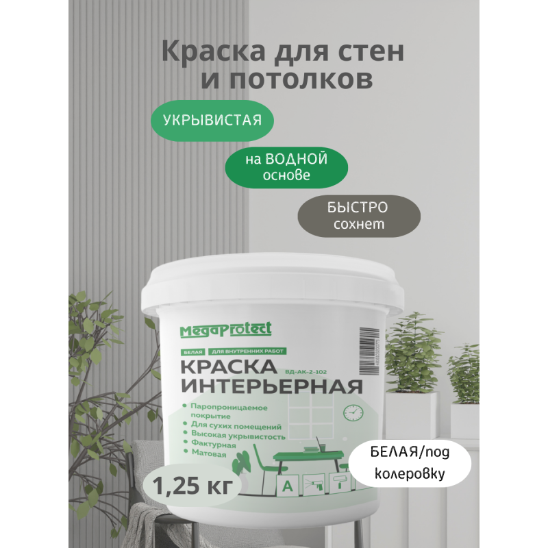 Краска интерьерная водоэмульсионная для внутренних работ "MegaProtect" предлагает идеальное решение для обновления вашего дома. Это универсальное покрытие для внутренних работ, подходящее для стен, потолков и дерева. Краска экологичная и безопасная, не имеет запаха, что делает ее идеальным выбором для отделки детских комнат и общественных учреждений. Благодаря быстрому времени высыхания в 1 час, вы можете быстро завершить работы и насладиться свежим интерьером. Подходит для обработки различных материалов, включая дерево, обои, штукатурка и кирпич. Состав на основе акрила обеспечивает долговечность и надежность покрытия, обладает хорошей укрывистостью. Окрашенную поверхность можно мыть без интенсивного трения. Выберите белый матовый цвет для создания чистого, уютного и светлого пространства в вашем доме. При желании краска легко колеруется в нужный оттенок.